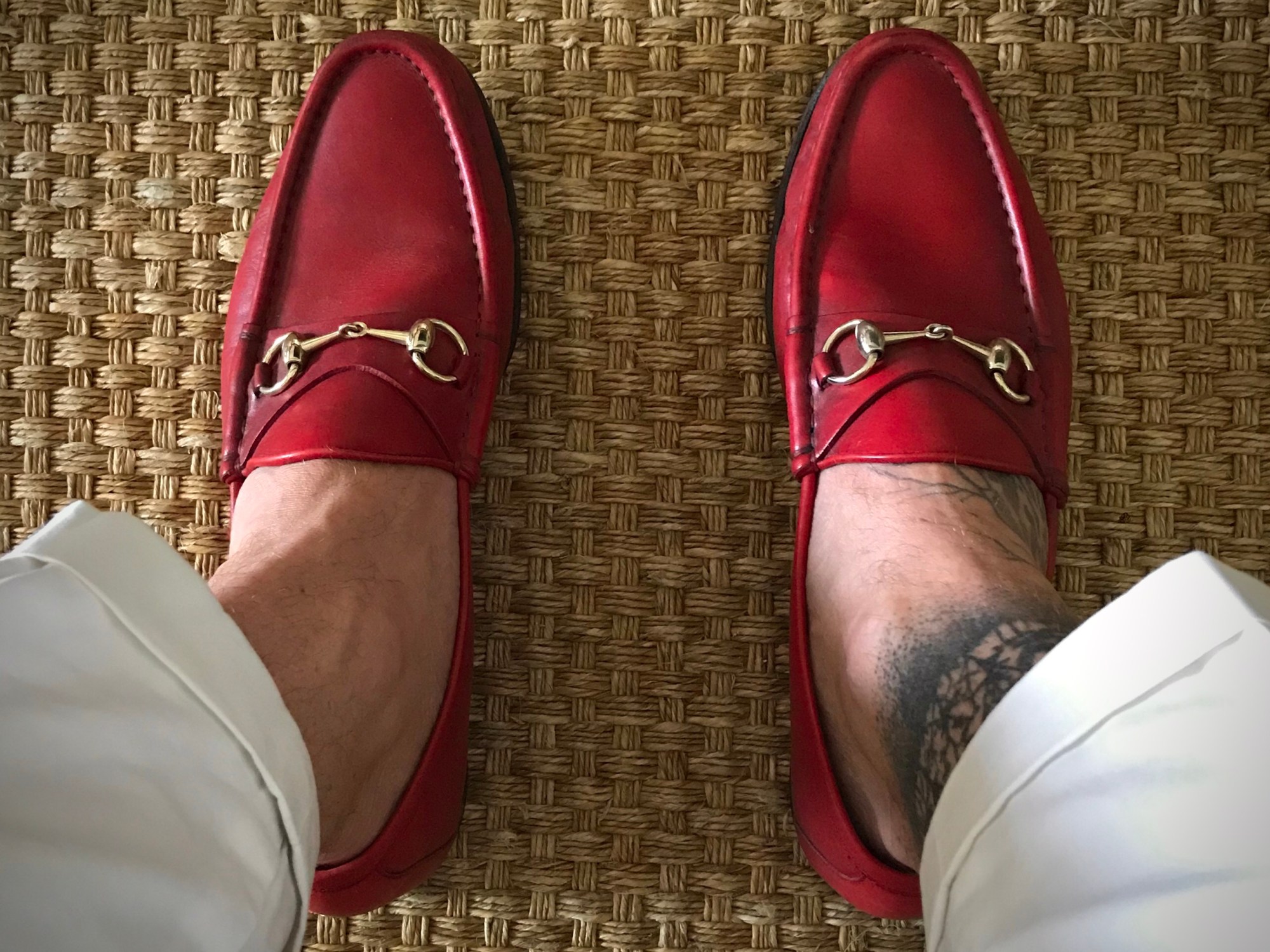 They are red – but not a Jordan red or Ferrari red. Something classier and less ostentatious. A slightly deeper, highly oxygenated blood red, with some patina that adds richness and character, and subtracts what might otherwise be a feather or two too peacocky for my tastes. They have a gold horsebit. They are one of maybe 6 pairs of non-brown/cordovan/oxblood/caramel shoes in my arsenal. They are rare. They are vintage. They are Gucci. They are, if I may say so, dope.